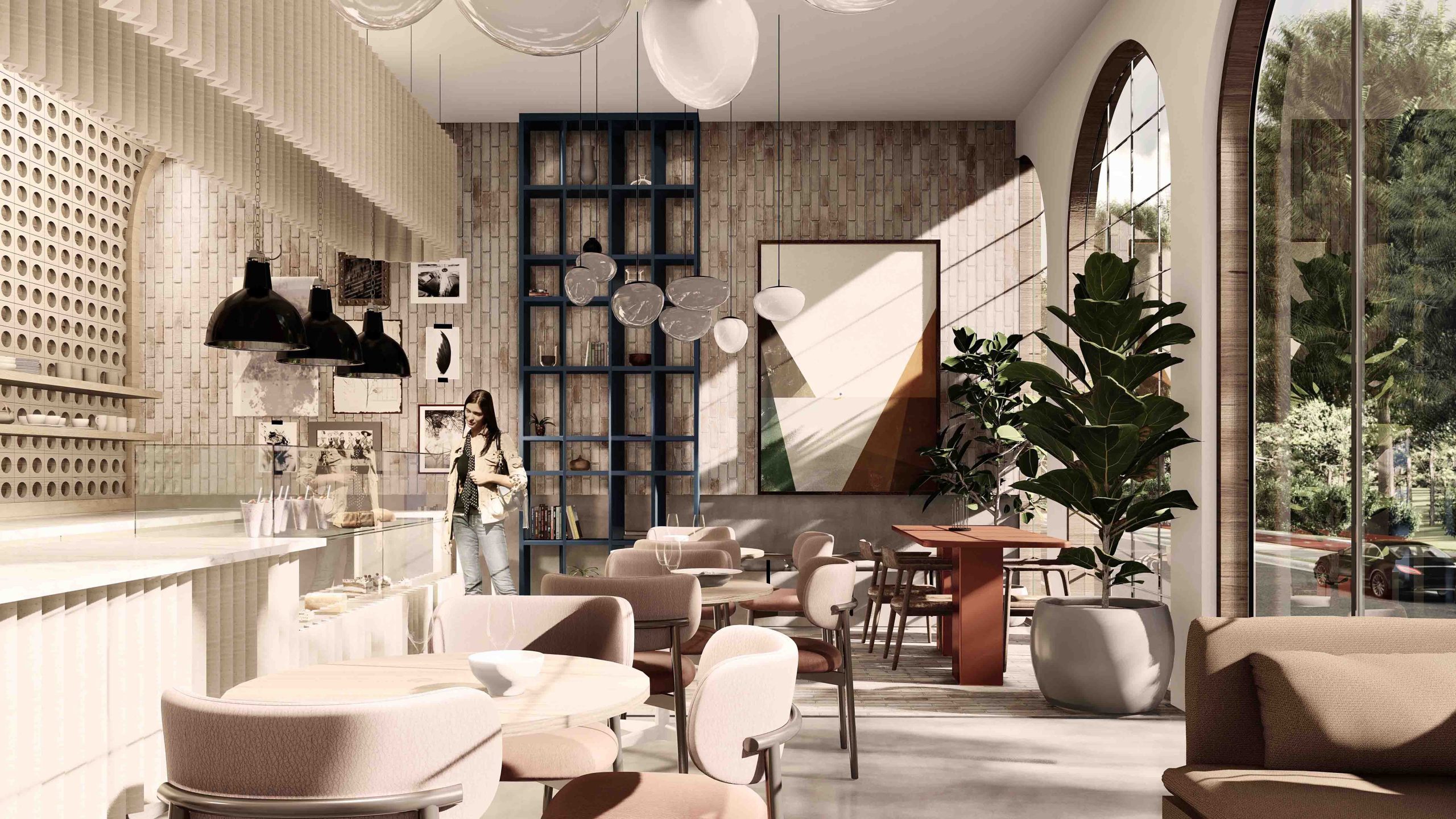 The space is defined by a palette of warm, earthy tones, with an iconic central counter positioned along the main entrance axis, serving as a focal point and brand signature.