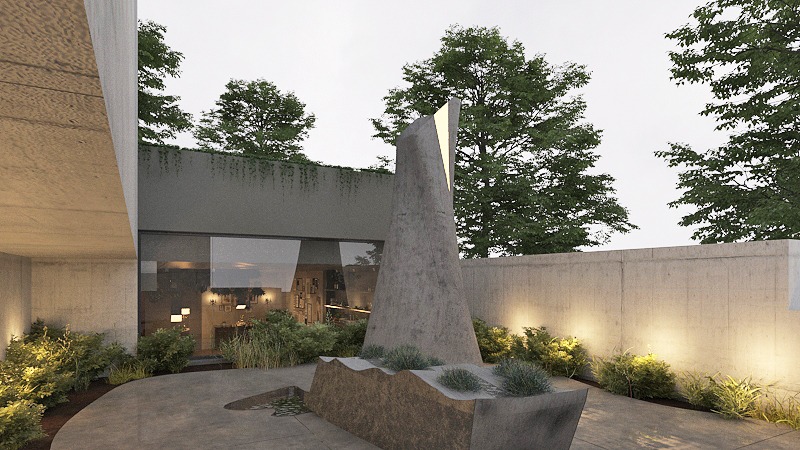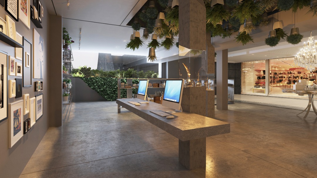 Uma área externa possui um elemento vertical emblemático e um espelho d’água que chama a atenção dos passantes. O uso de plantas no exterior estende-se de forma contínua para o interior, integrando visual e espacialmente os dois ambientes. Essa continuidade verde chega até o teto da loja, reforçando a sensação de fluxo natural e coesão por todo o espaço.