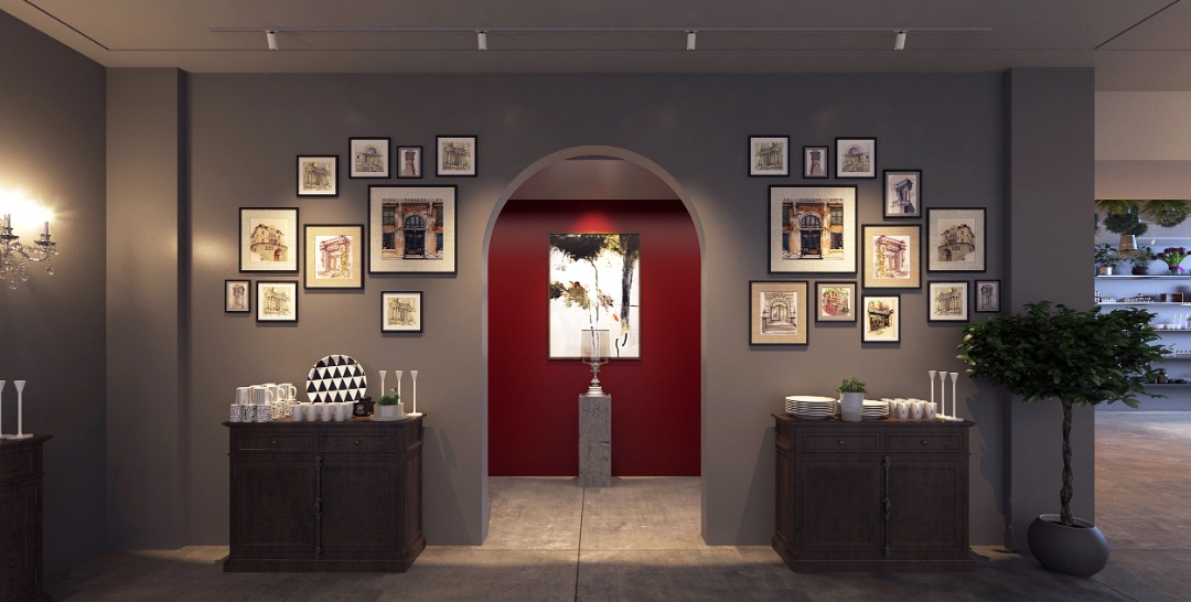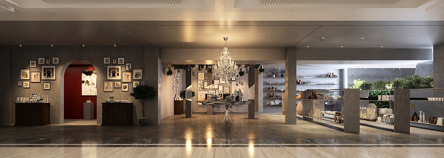 Diferentes áreas da loja foram projetadas para reproduzir espaços domésticos, exibindo os acessórios da marca em contexto. O hall principal apresenta os produtos em um layout claro e orientado para objetos, realçado por uma iluminação decorativa que destaca sua forma e qualidade material.